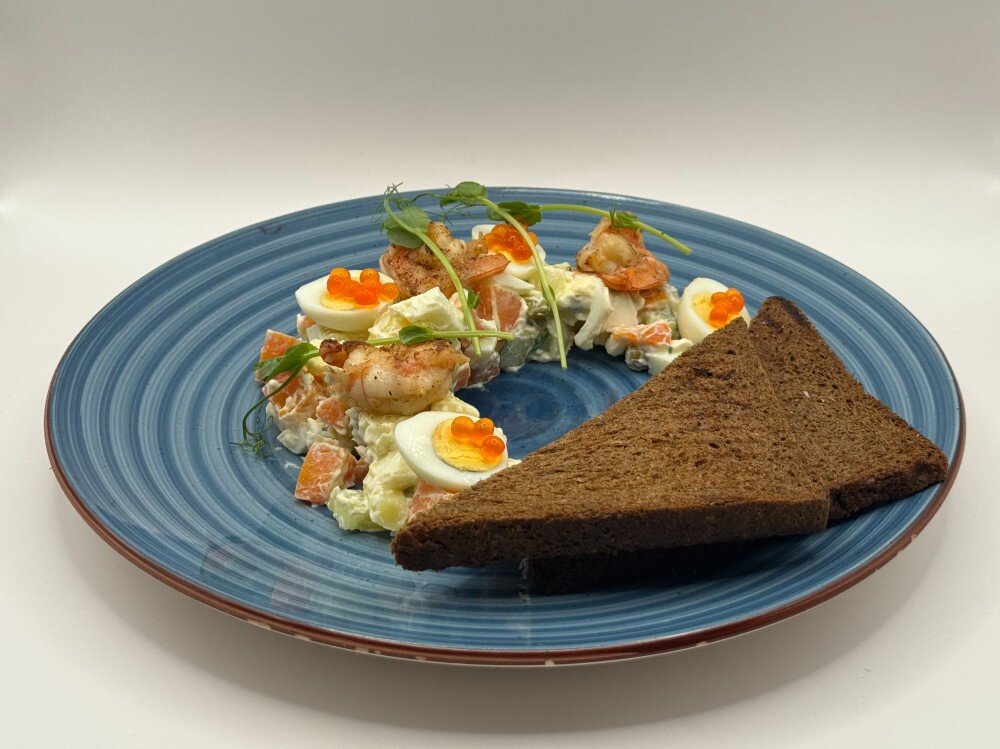 Обновлённая версия классического салата с изысканным акцентом: нежный отварной картофель и морковь в дуэте с сочными обжаренными креветками, свежим огурцом, отварным яйцом и сладким зелёным горошком. Заправлен сбалансированным майонезным соусом, который подчёркивает морские ноты и лёгкую пикантность. Украшен имитацией икры и свежей микрозеленью для элегантной подачи. Идеальный выбор для тех, кто ценит знакомый вкус в современной интерпретации