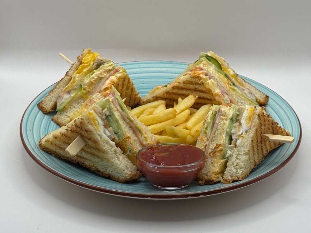 Многослойный и невероятно сытный сэндвич в лучших традициях американской кухни: высокий, собранный на свежем американском тостовом хлебе из собственной пекарни. Внутри — сочетание нежного куриного филе, ароматной ветчины, ломтиков сыра, свежего огурца, сочных томатов, жареного яйца и хрустящего листа салата айсберг. Подается с картофелем фри. Идеально для сытного перекуса или быстрого обеда