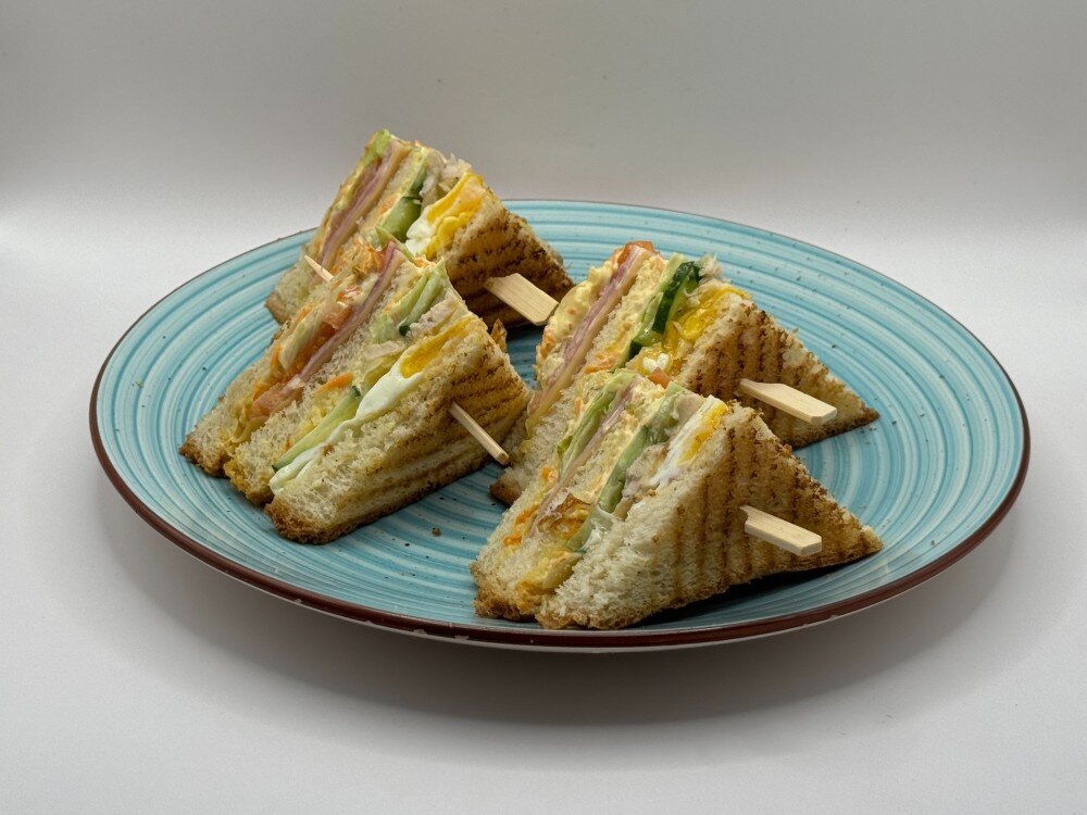 Многослойный и невероятно сытный сэндвич в лучших традициях американской кухни: высокий, собранный на свежем американском тостовом хлебе из собственной пекарни. Внутри — сочетание нежного куриного филе, ароматной ветчины, ломтиков сыра, свежего огурца, сочных томатов, жаренного яйца и хрустящего листа салата айсберг. Идеально для сытного перекуса или быстрого обеда