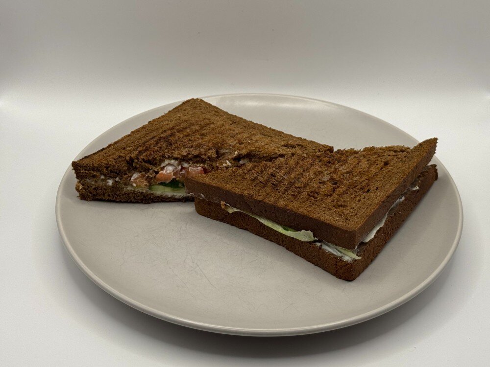 Сэндвич на фирменном солодовом хлебе с нежным слабосоленым лососем, творожным сыром, хрустящими листьями салата, свежим огурцом, помидором