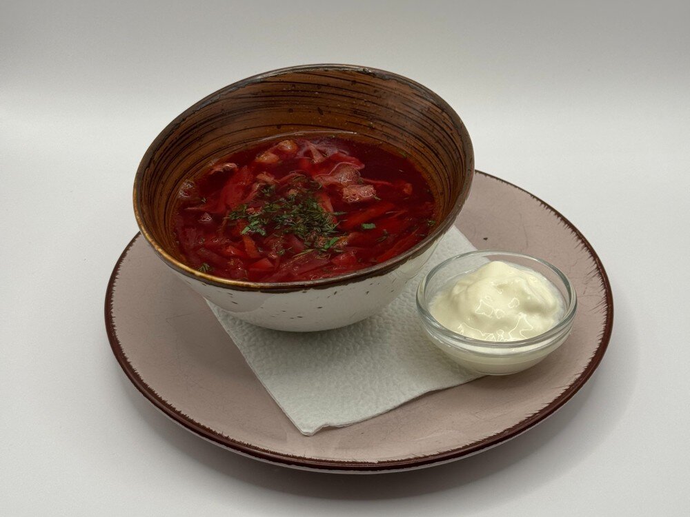 Сытный борщ, приготовленный по классическому русскому рецепту, с нежной говядиной и беконом,