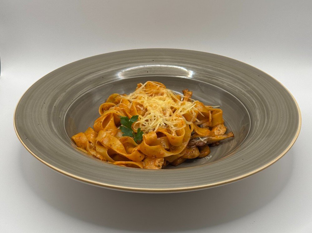 Сытное и гармоничное блюдо итальянской кухни: фетучини в сливочном соусе с обжаренным цыпленком и ароматными шампиньонами. Сочетание мягкого мяса, грибов и пасты создаёт уютный, насыщенный вкус. Идеально для тех, кто ценит классические комбинации и любит, когда в тарелке соединяются простота и глубина вкуса.