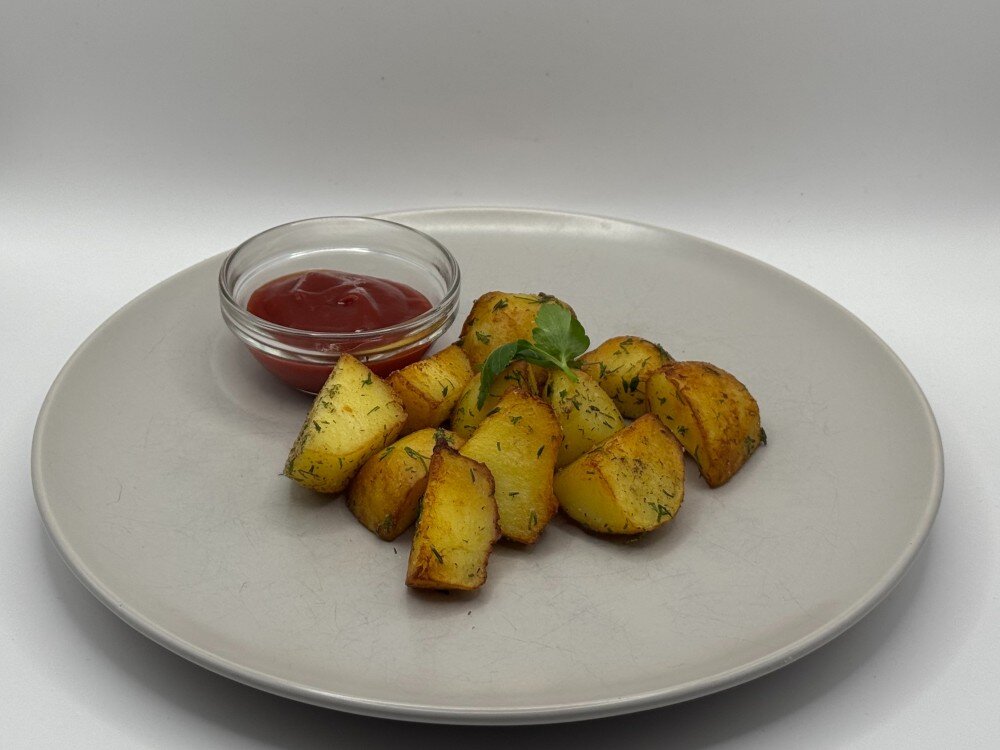 Нежный молодой картофель, обжаренный до золотистой хрустящей корочки с добавлением свежих трав — розмарина, тимьяна и чеснока.
